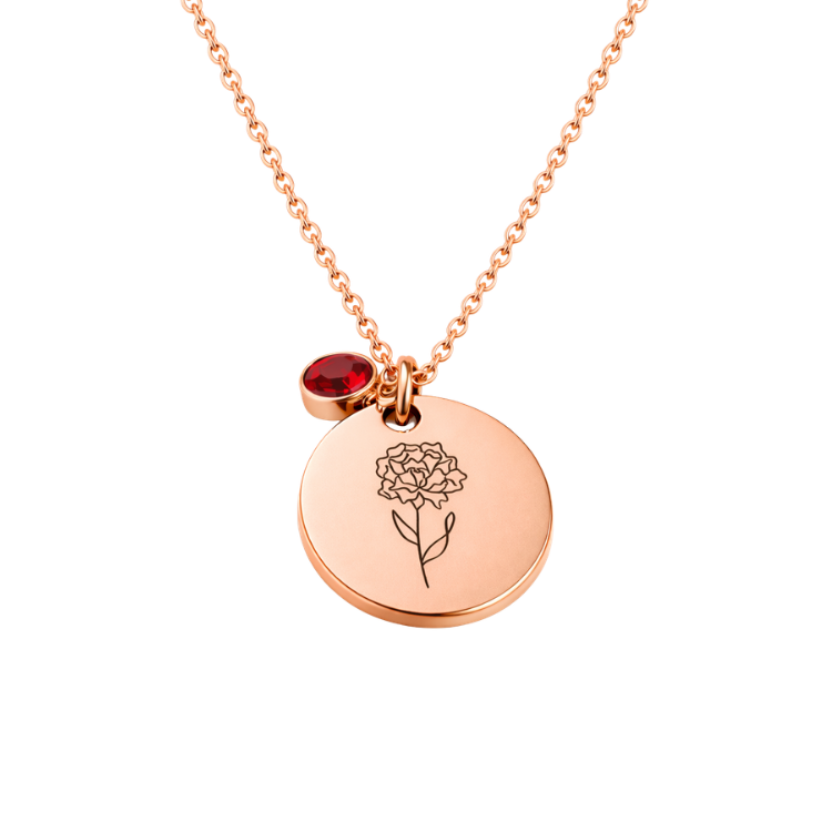 Elegante geboortebloem ketting met anjer gravure en warme rode steen. Een tijdloos sieraad in rosé goud voor de maand januari.